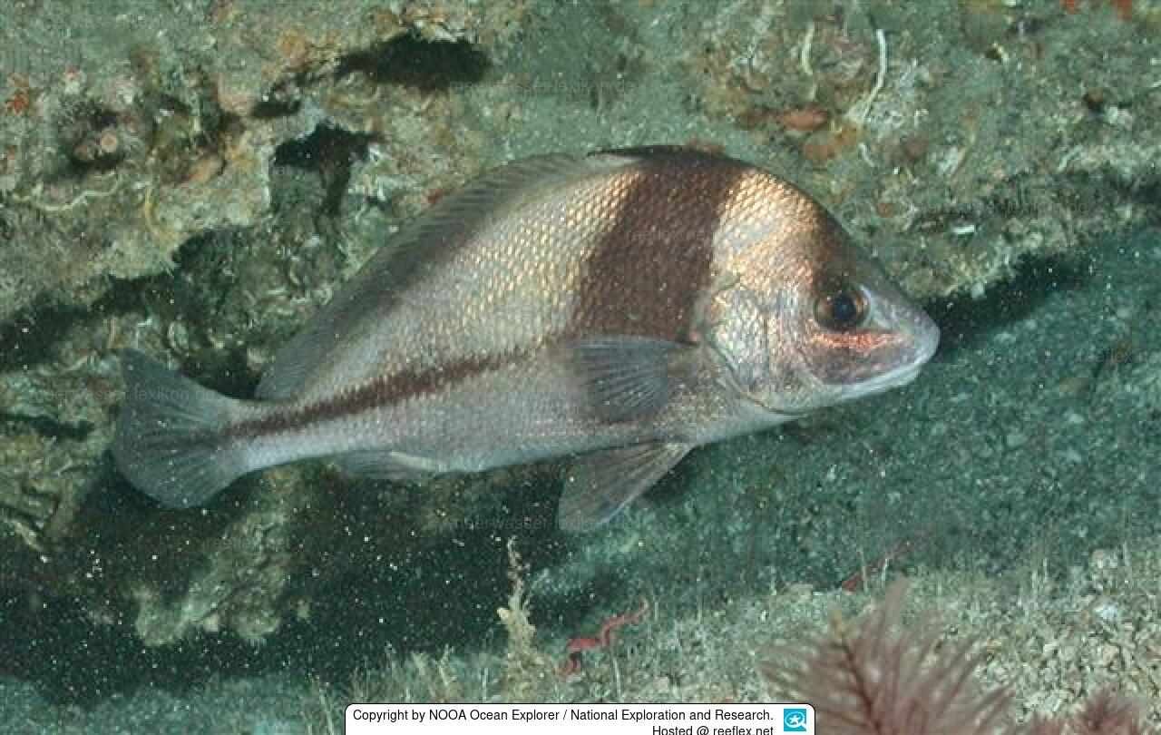 Von der ersten Rückflosse bis zur Brustflosse verläuft ein breiter, dunkler Streifen, über die Stirn und das Auge ein weiterer Streifen.