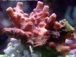 Description: Colonies are branching, with Acropora-like axial corallites. On upper reef slopes, colonies have compact branches; on soft substrates, branches are more open and colonies are fragile. Primary septa vary from 10 to 12 in number. Costae are usually weakly developed.