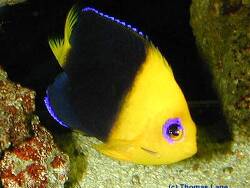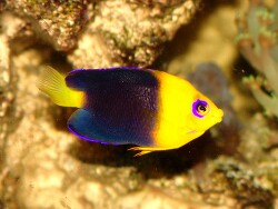 Known only from remote Cocos-Keeling and Christmas Island in the eastern Indian Ocean, Centropyge joculator is seldom available to the US aquarium trade. Most specimens that are collected go to Japan, since logistics of getting them from their origin into the US are difficult and expensive. Found in coral and rubble areas on steep outer reef slopes. Solitary or in small groups of four to five individuals.