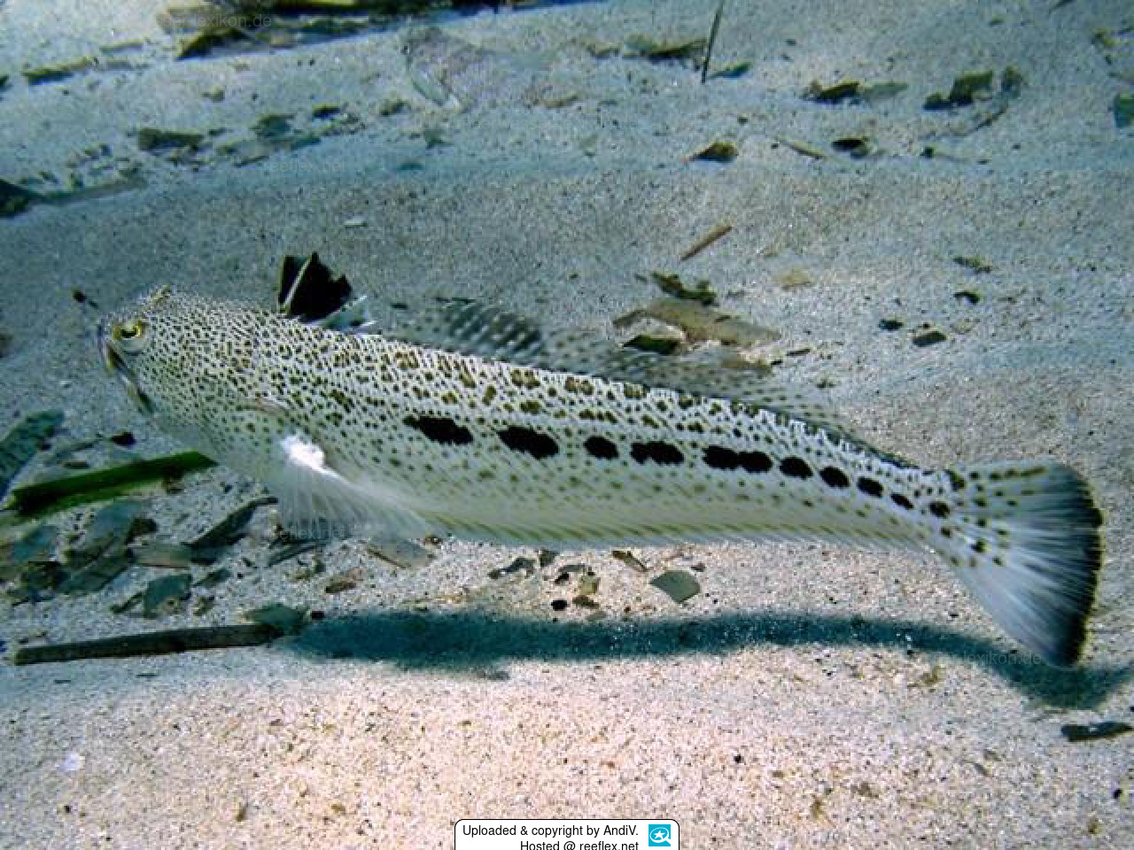 It is up to 45 cm long, brown and yellow on the head and back, paler below with darker spots along the sides. The shape of its body is long and laterally flattened, the mouth almost is vertical in the head[1]. The front half of the first dorsal fin is black and consists of three spines which are highly poisonous, as are the backward facing spines on the extremities of the gill covers! It inhabitates at shallow waters to about 100m depth near rocks and sea grass nearby, burrowing in the bottom. Just as other weevers, it feeds on small fishes and crustaceans