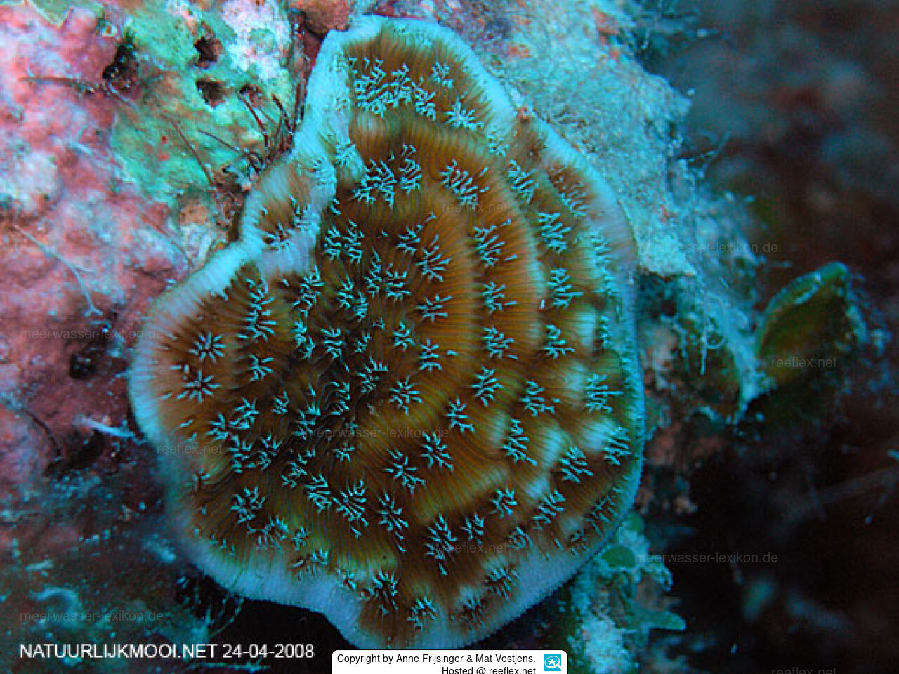 Characters: Colonies form flat unifacial explanate plates with corallites in long, roughly concentric valleys. Valleys are closely (2-4 mm) spaced. Corallites are small, close together (5-8 per cm) and face upwards. Columellae are weakly developed.