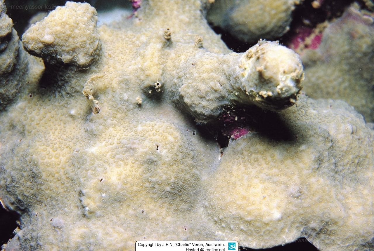 Similar Species: Porites lichen, which commonly has corallites aligned in rows. Corallites are similar to those of P. lutea and P. cocosensis."