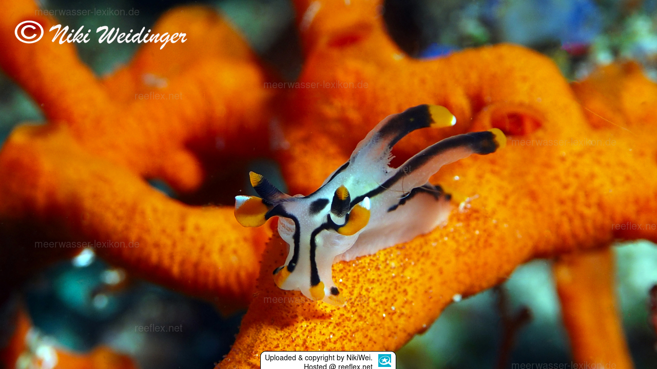 This species feeds on Bryozoan (moss animals).Thecacera picta lives on sand and rubble bottom.There are several color variations and various patterns of this nudibranch.