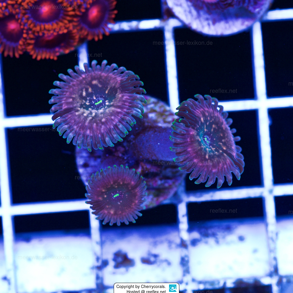 These beautiful Palythoa or button polyps are sold as Palythoa „Purple Passions“ at Local fish Dealers and in online coral Shops. Many Thank to Cherrycorals for the wonderful picture.